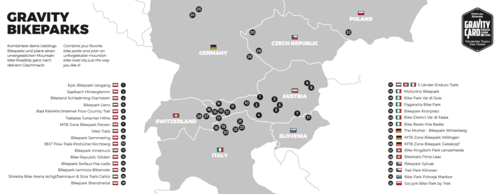 Z Gravity Card czekają na Ciebie 32 miejsca z rowerową zajawką – idealną mieszanką bike parkowych tras i ścieżek enduro rozsianych po dużej części Europy. Ścieżki w Niemczech, Austrii, Czechach, Szwajcarii, Słowenii, Włoszech i teraz także Polsce są w Twoim zasięgu na nadchodzący sezon.
