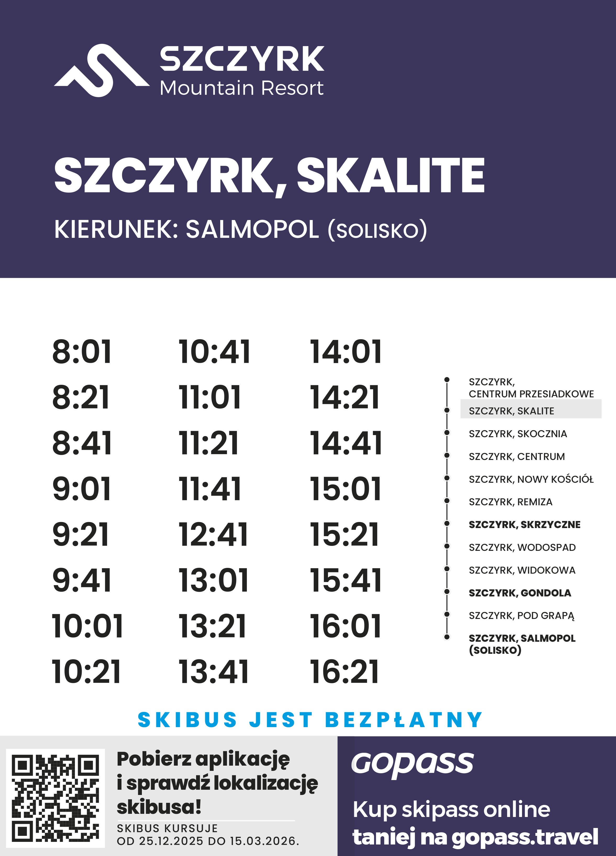 Od 25.12.2025 do 15.03.2026 uruchamiamy DARMOWĄ komunikację publiczną na linii Skalite - Szczyrk Gondola - Solisko.